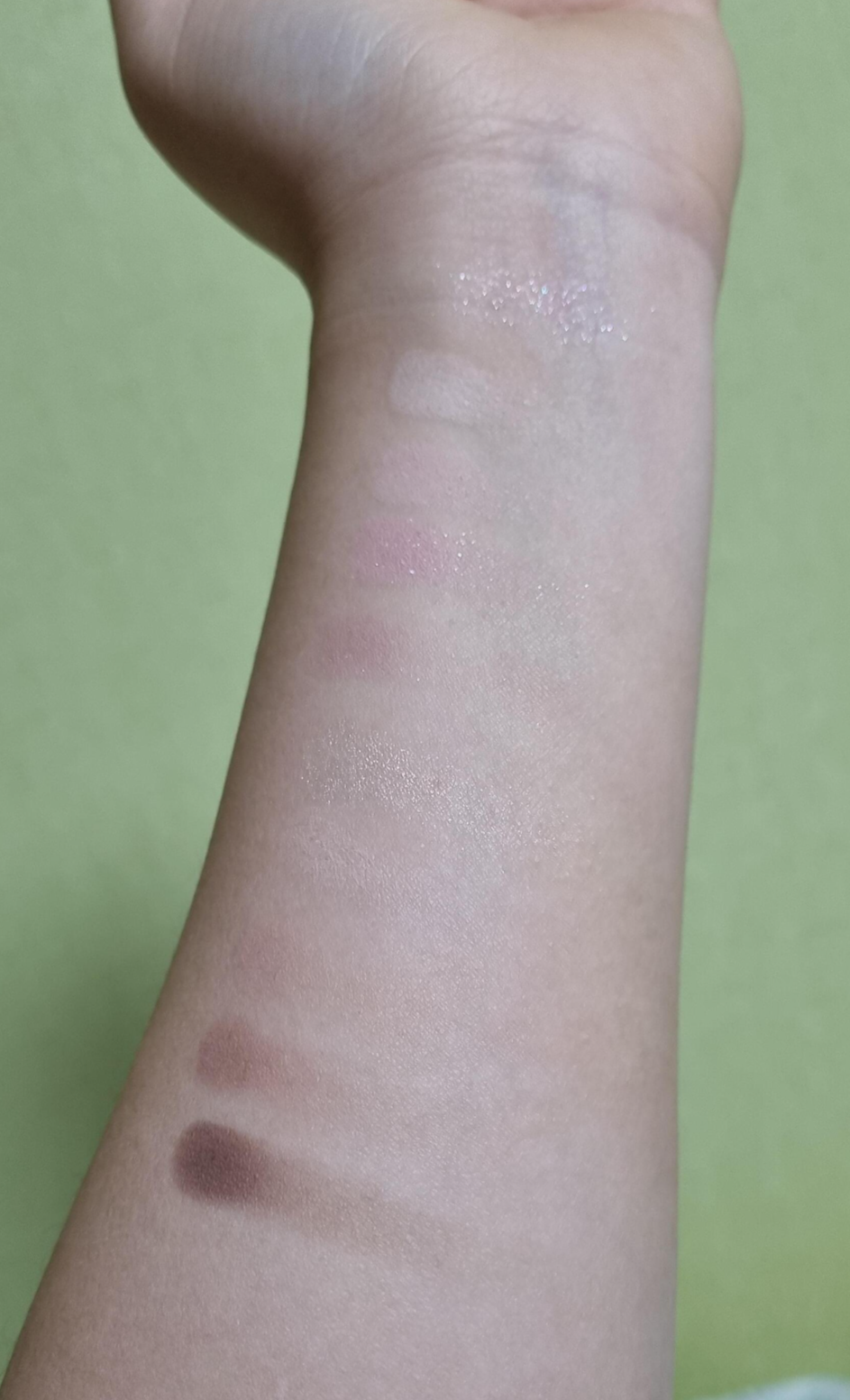 두번째줄 첫 번째 섀도우는 약간 밀도가 낮은 쉬머 섀도우 같은 느낌이 든다. 베이지 핑크, 약간 흐으으음 살구? 및이 도는 펄이 들어있다. 얘도 예쁨! 약간 그 이프탈리즘 페어리핑큰가 그 하이라이터랑 비슷한 느낌이 든다 !