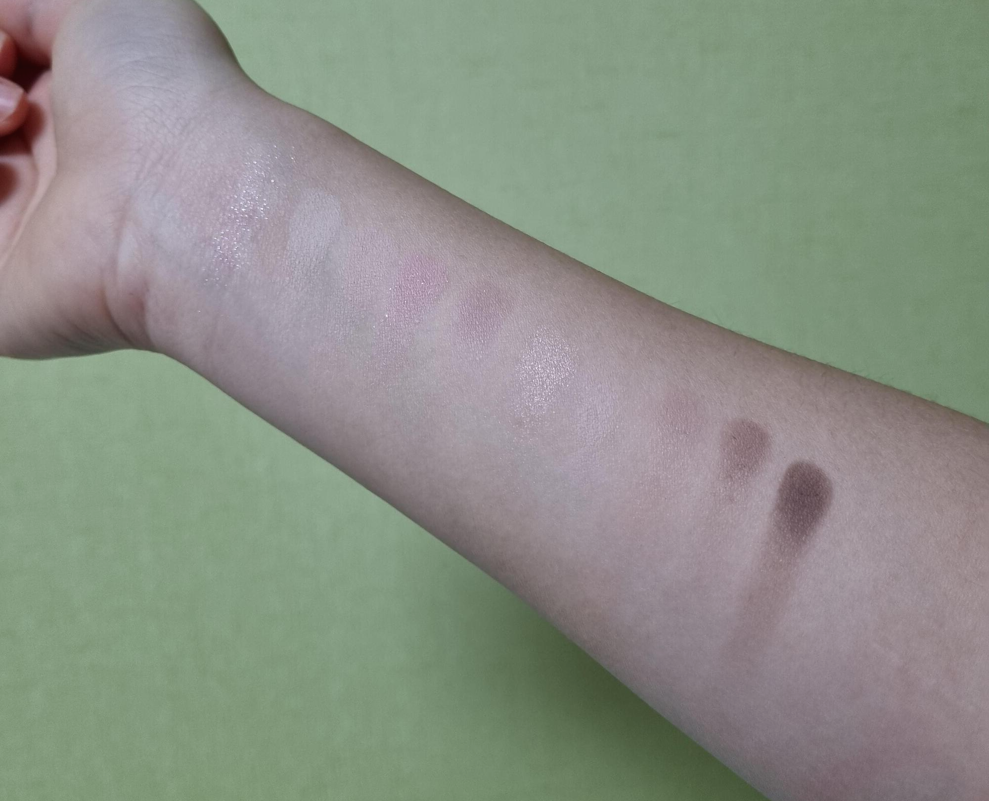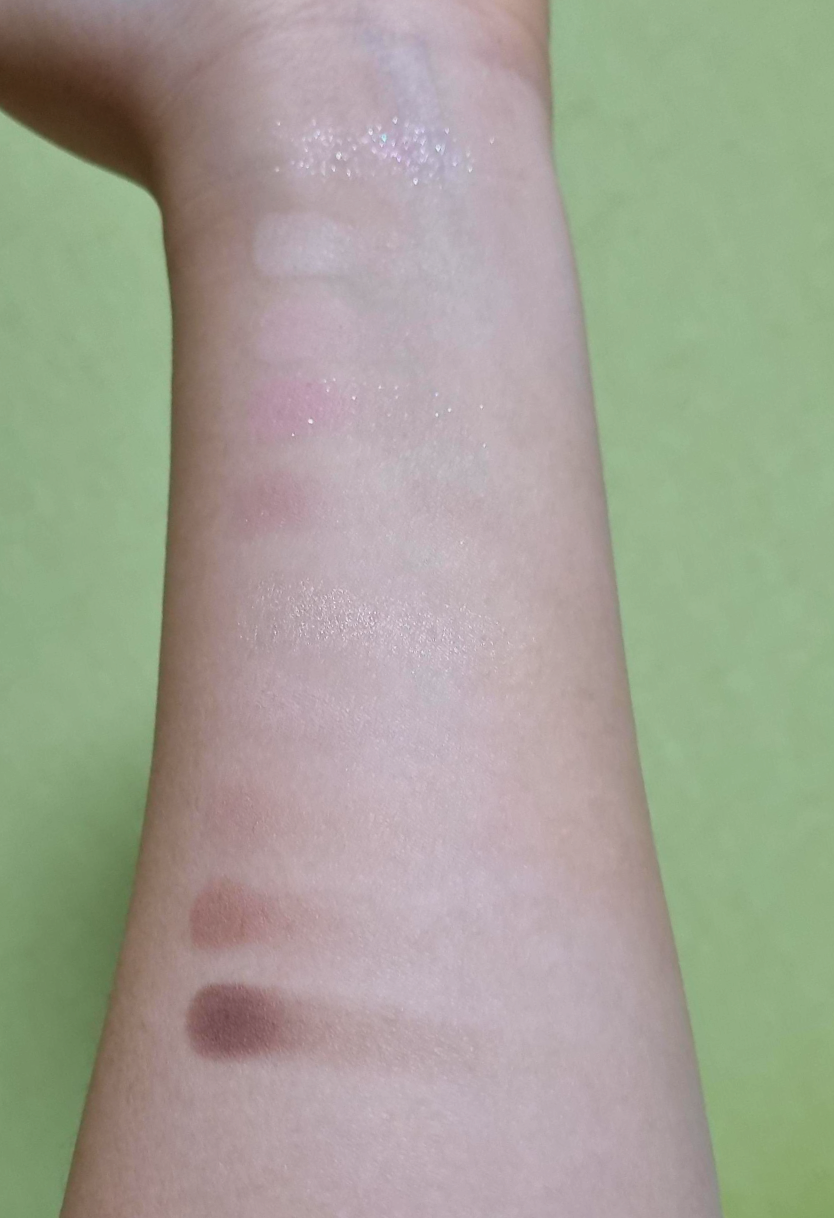 윗줄 첫번째 섀도우는 화사한 흰 펄과 핑크 펄이다. 펄 입자가 크지는 않지만 광채가 오1져서 화려한 느낌이 든다.